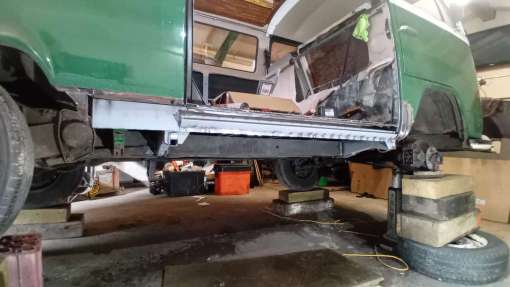 Arran’s Bay window VW T2 came in with a few scabs for repair . . . by the time we had finished poking around unfortuately it needed inner and outer sills both sides and all 4 jacking outriggers. So often the case, especially with vans that have not been MOT’d regularly. Just because it doesn’t need an MOT anymore . . . doesn’t mean it isnt rusting!